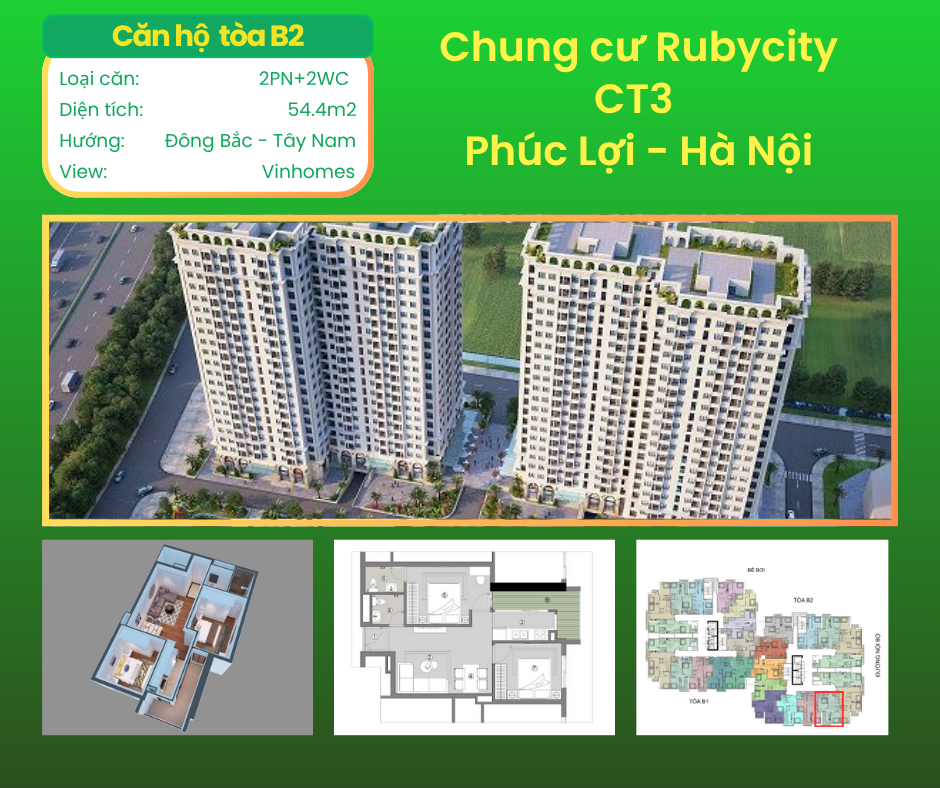 Diện tích 54,4m2 thiết kế 2 phòng ngủ, 2 Wc, 1 bếp tách riêng, 1 khách.